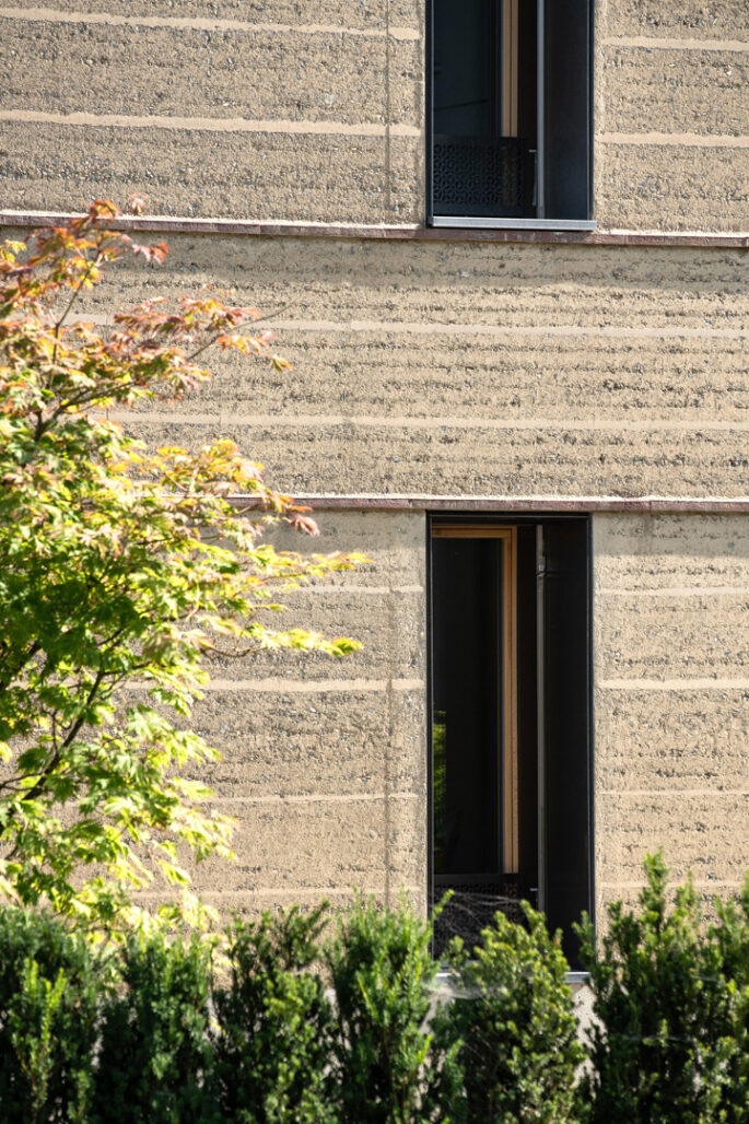 Architektur: Carlos Martinez, Vorgefertigte Stampflehmelemente mit Trasskalkleisten als Vorsatzschalen Innen und Außen. Fotos Hanno Mackowitz