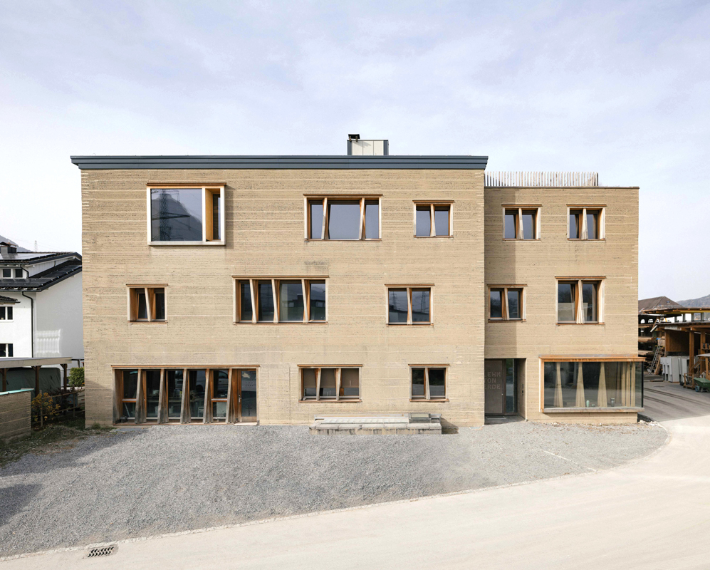 Die 67 Meter lange und bis zu 24 Meter breite Halle für die Vorfertigung von Stampflehmwänden mit einem angegliederten dreigeschossigen Bürotrakt ist eine Hybridkonstruktion aus tragenden Stampflehmwänden und verschiedenen Holzbautechniken. Die zwischen 60 und 90 Zentimeter starke Südwand besteht aus lokal gewonnenem Lehm, der vor Ort in Schalungen eingebracht und verdichtet wurde. Deren Masse leistet ausgezeichnete Schalldämmung zu direkt angrenzenden Wohnhäusern und schützt die Halle im Sommer vor Überhitzung.