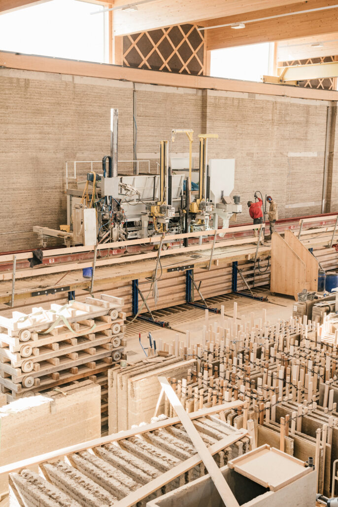 So war auch die eigene neue Werkhalle in Schlins (Bauzeit 2019 bis 2022) die Weiterentwicklung früherer Produktionsstätten. Ziel war es, den Lehmbau industrietauglich zu machen. Ausgangspunkt waren Maschinen aus den früheren temporären Produktionsstätten Laufen in der Schweiz und Darmstadt. Auch die Logistik der vorgefertigten Bauteile wurde hinsichtlich der Wiederverwertung nachhaltiger Materialien dauerhaft optimiert.