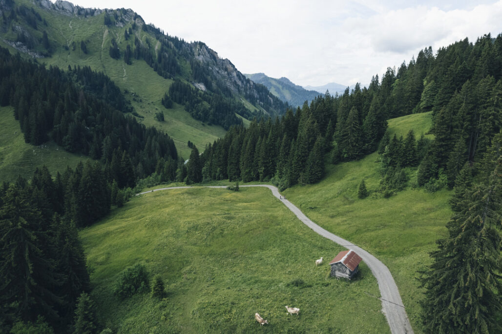 Neben einzelnen schroffen Gipfeln finden sich im Bregenzerwald auch viele sanfte und grün bewachsene Berge mit Wiesen und Alpen.