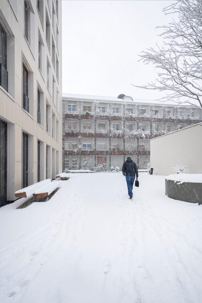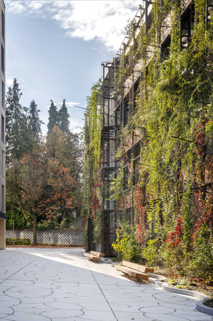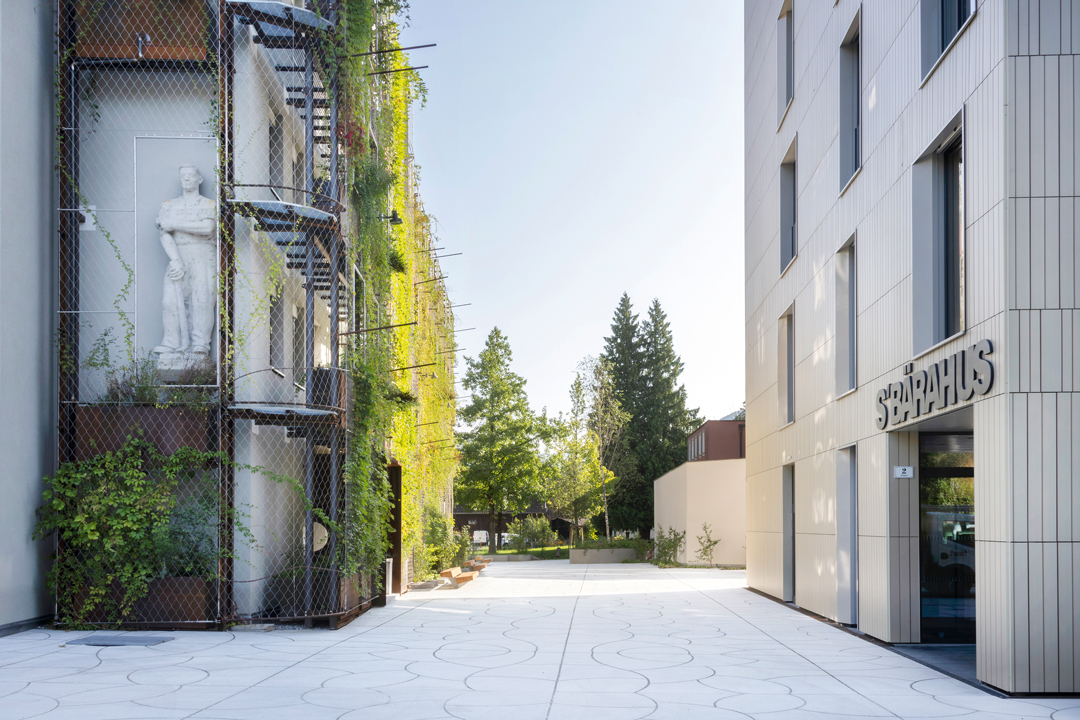 Ein Leuchtturmprojekt – so bezeichnet Andreas Lampert, Direktor der Arbeiterkammer Vorarlberg, die Neugestaltung des AK Quartiers in Feldkirch, das im vergangenen Jahr eröffnet wurde: „Wir sind die Ersten, die so etwas umgesetzt haben.“ Es ist ein ambitioniertes und zukunftsweisendes Projekt: Die größte Grünfassade Vorarlbergs – und eine der fünf größten in ganz Österreich – wurde am Gebäude der Arbeiterkammer Feldkirch realisiert. „Mir war es besonders wichtig, ein einheitliches Bild des Gebäudeensembles im Quartier zu vermitteln.“ Die Vision, die dahintersteht, ist eine identitätsstiftende, transparente, zur Stadt Feldkirch hin geöffnete, naturverbundene Platzgestaltung, die zur Belebung und Aufwertung der Gegend beitragen und ein attraktives Arbeitsumfeld für alle Mitarbeitenden schaffen soll. „Das AK Quartier soll mehr als ein Platz sein: ein Treffpunkt für alle Menschen mit niederschwelligem Zugang und ohne Konsumzwang“, sagt Andreas Lampert. „Anders als normal ist genial“, so sein Standpunkt. „Wir wollten nach außen ein Zeichen setzen, wofür die Arbeiterkammer Vorarlberg steht, nämlich für Innovation in Sachen Dienstleistung in allen Beratungsfeldern für die Arbeitnehmerinnen und Arbeitnehmer.“