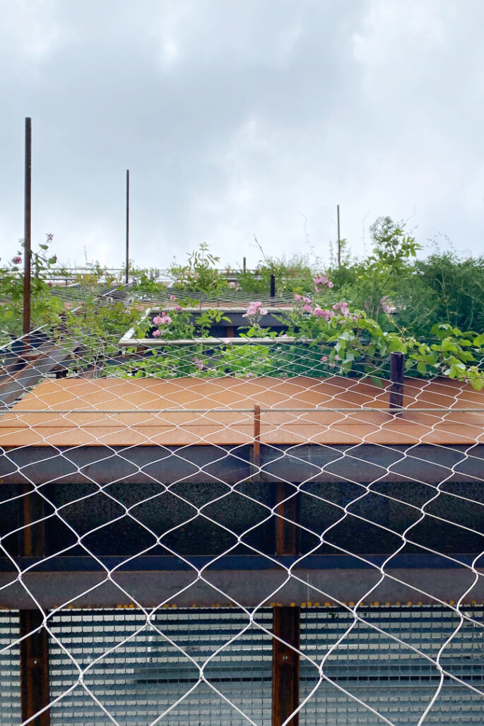 Von der Anfrage bis zur Umsetzung des Projekts dauerte es zwei Jahre. Stets mussten neue Aspekte berücksichtigt werden: „Für uns galt es, einen Zeitraum von mindestens fünfzig Jahren zu bedenken. Also einen Zeitraum, den wir womöglich nicht mehr erleben. Eine Klimaanlage wird eingebaut und funktioniert. Aber die Errichtung einer Grünfassade braucht Zeit und Geduld – dies aber auch vom Auftraggeber.“ Ein weiterer Zukunftsaspekt, der berücksichtigt werden musste, sind die Auswirkungen der Klimakrise. Die Pflanzenwelt verändert sich unweigerlich durch die globale Erwärmung. „Innerhalb der Fassade herrschen drei Klimazonen, im obersten Bereich haben wir bereits jetzt mediterrane Temperaturen. Ich habe im vergangenen Sommer 45 Grad an der Außenwand gemessen. Auf der Grünfassade hingegen kamen wir auf 23 Grad, was verdeutlicht, wie gut diese funktioniert. Allerdings braucht es für die Begrünung auch die entsprechenden Pflanzen, die eben hitze- und trockenresistent sind. Manche Pflanzen werden sich auf 10 bis 15 Meter ausbreiten, andere werden verschwinden. Es bleibt ein spannender Prozess.“