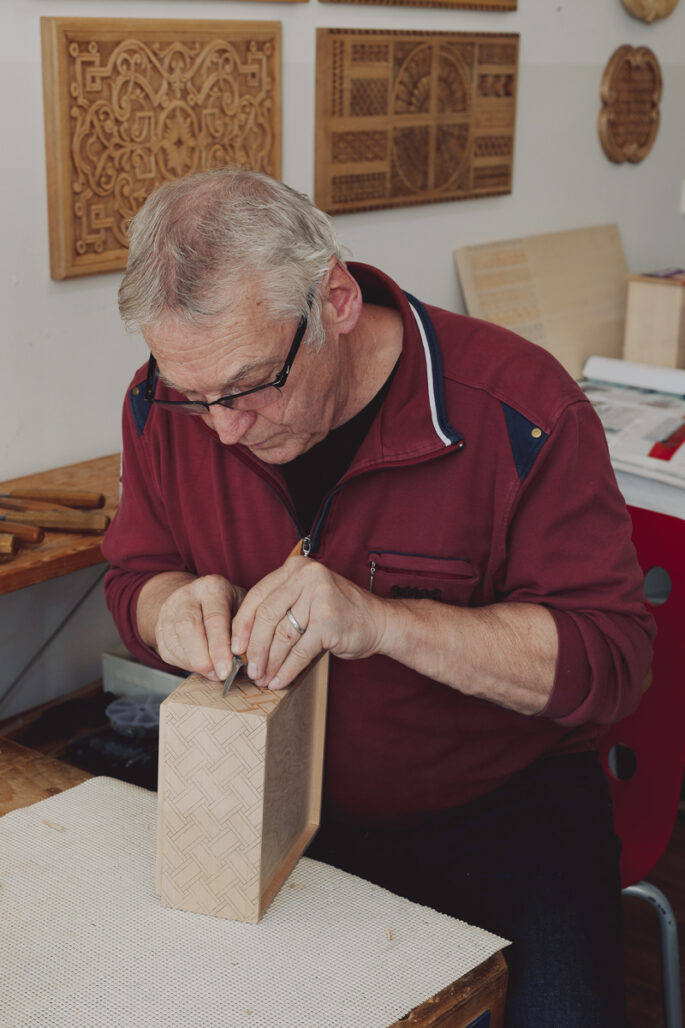 Für die Stadlhofers ist die Arbeit nicht nur ein kreatives Abenteuer, sondern auch eine Herzensangelegenheit. Ihre Schnitzstube existiert seit 1995, seit 2010 betreiben sie in Wien eine Werkstatt, in der sie neben Auftragsarbeiten auch Kurse anbieten. „Viele Teilnehmende sehen die Kurse als Auszeit vom Alltag“, sagt Andrea Stadlhofer. „Man genießt es, etwas mit den Händen zu schaffen, selbstwirksam zu sein und am Ende ein fertiges Objekt in den Händen zu halten.“ Auch Kai Linke betont den besonderen Mehrwert des Handwerklichen: „Ich hoffe, dass man spürt, wie lebendig Handwerk sein kann und dass in jedem Muster eine Geschichte steckt. Vielleicht haben die Besuchenden auch ein Stück dieses Dialogs mitgenommen: die Idee, dass Gestaltung immer ein Zusammenspiel von Kopf, Hand und Herz ist.“ Für ihn ist es die Kombination aus Kreativität und Technik, die das Projekt besonders macht. „Design eröffnet Wege, die den Menschen im Handwerk Möglichkeiten geben, ihr Fachwissen neu einzusetzen.“ Und die Perspektiven sind klar: Die Zusammenarbeit soll weitergeführt werden. „Es gibt viele offene Ideen – etwa gedrechselte Nussknacker mit einer geschnitzten Oberfläche“, verrät Kai Linke. Auch die Stadlhofers sind gespannt, wie sich die Kooperation entwickelt. „Es ist ein Austausch, der gerade erst begonnen hat“, sagt Franz Stadlhofer. „Wir haben bereits viel gelernt und noch sehr viel vor.“