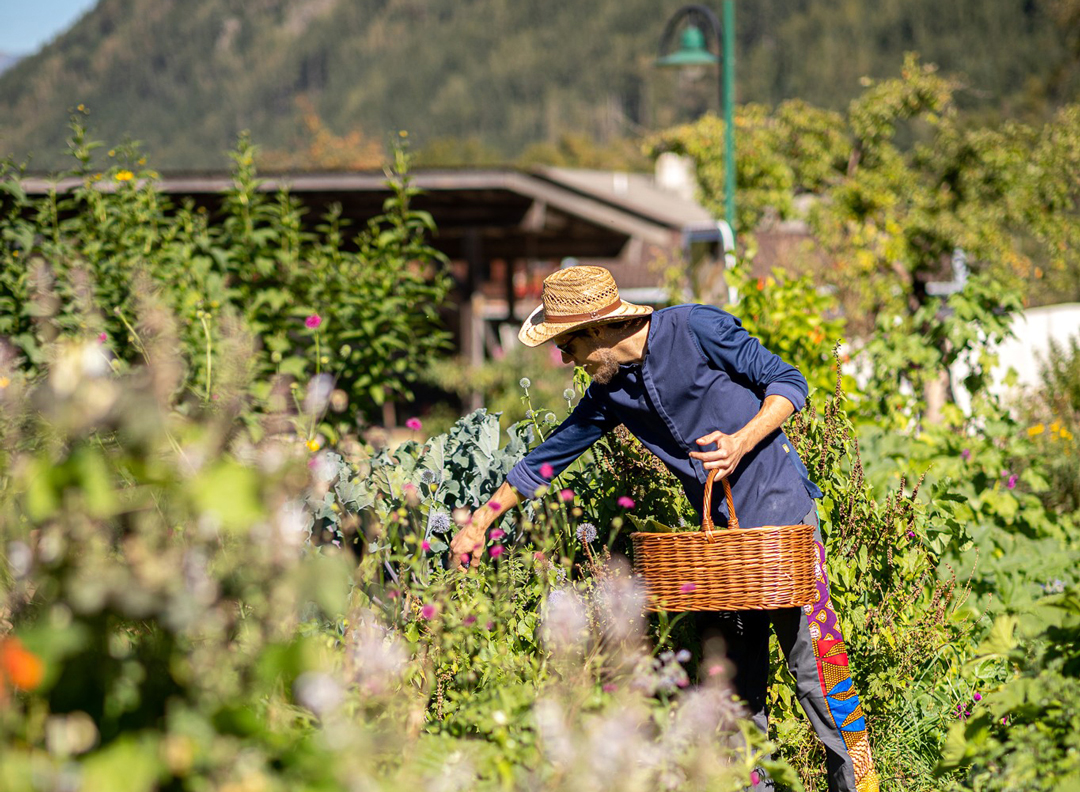 Heute baut Fankhauser rund 800 Pflanzen in seinem Permakultur-Garten an – ausschließlich aus altem Saatgut der Arche Noah. „Es ist wichtig zu wissen, welche Pflanzen miteinander harmonieren und sich gegenseitig unterstützen“, erklärt er. Rund 70 bis 80 Prozent der Lebensmittel, die in seiner Küche landen, stammen aus diesem Garten. Was er selbst nicht anbauen kann, bezieht er aus der Region: Milchprodukte und Eier von Demeter-Betrieben in der Umgebung, Urgetreide von Tiroler Bio-Höfen. Produzentinnen und Produzenten, die er nicht persönlich kennt, kommen nicht infrage. Vertrauen sei für ihn schließlich kein Marketingbegriff, sondern Voraussetzung. „Was ich nicht in entsprech-ender Qualität bekomme, kommt nicht auf den Teller“, sagt er. „Als Koch bin ich flexibel –