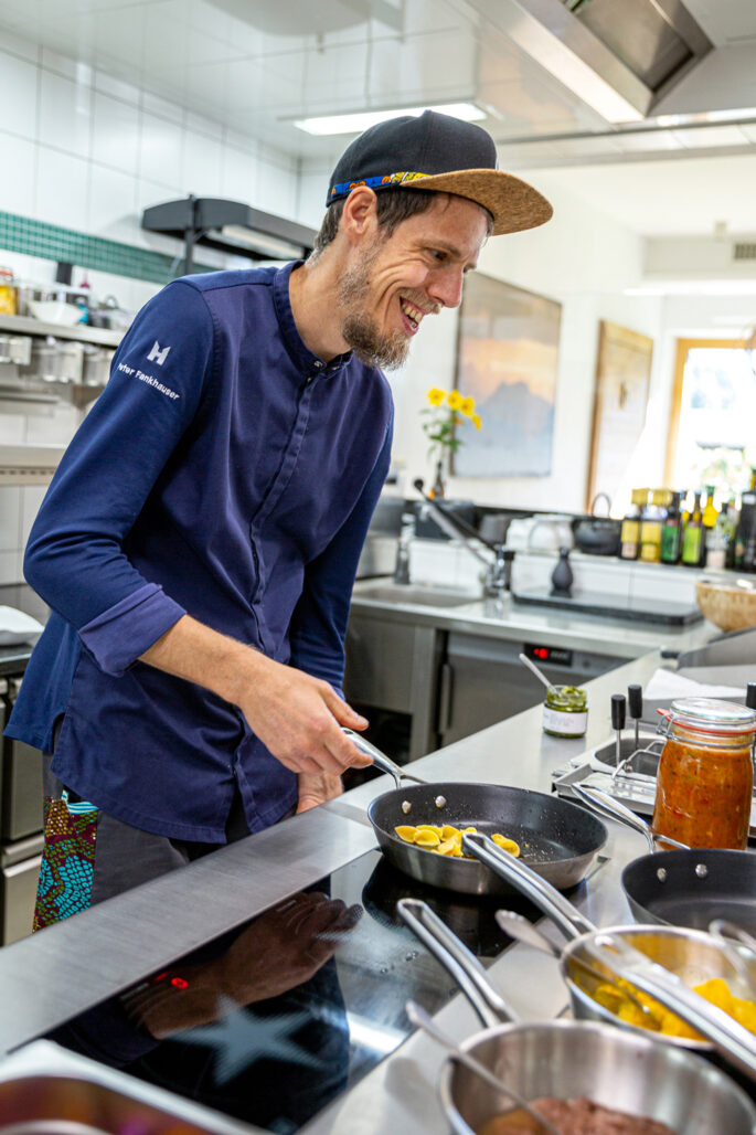 An manchen Tagen liegt frühmorgens noch Tau auf den Blättern, wenn Peter Fankhauser durch seinen Garten schlendert. Ein paar Schritte nur sind es vom Restaurant hinaus ins Grüne, dorthin, wo Obst, Gemüse und Kräuter in Permakultur wachsen und das Summen der Insekten den Soundtrack des Tages prägt. Hier draußen entscheidet sich, was später gekocht wird. Oder eben nicht. „Permakultur heißt für mich, konsequent im Einklang mit der Natur und den natürlichen Kreisläufen zu arbeiten – nicht gegen sie“, sagt der gebürtige Tiroler. „Nicht beschleunigen, nicht manipulieren, sondern beobachten, verstehen und begleiten.“