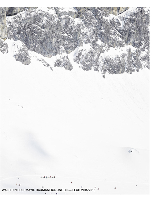 Katia und Gerold Schneider haben im Rahmen ihres „allmeinde commongrounds“-Projekts Walter Niedermayr in die alpine Landschaft von Lech eingeladen, die stark durch den Tourismus geprägte Wahrnehmung von Landschaft durch (s)einen „fremden“ Blick zu weiten. Vom Winter 2015 bis zum Sommer 2016 entstand hier eine Serie seiner mehrteiliger Arbeiten. Walter Niedermayrs subtile, vielschichtige Arbeit ist eine exemplarische künstlerische Auseinandersetzung mit diesem Raum. Sie zeigt die Koexistenz verschiedener Formen der „Raum-Aneignung“ einer Landschaft: „Es gibt in den meisten meiner Fotografien eine bestimmte Gleichwertigkeit zwischen Landschaft, Menschen und Infrastruktur, denn es geht mir um eine Ausgewogenheit in der Betrachtungsweise und damit um eine gewisse distanzierte Haltung.“ (Walter Niedermayr). walterniedermayr.com, allmeinde-art.com