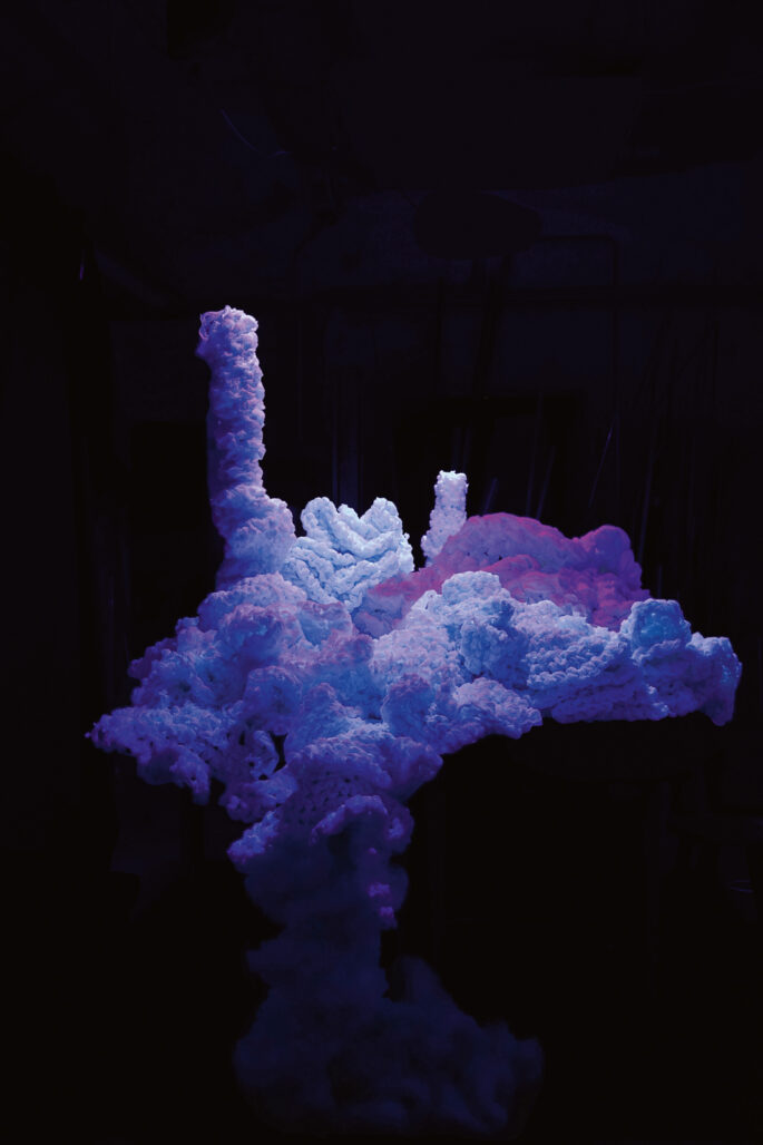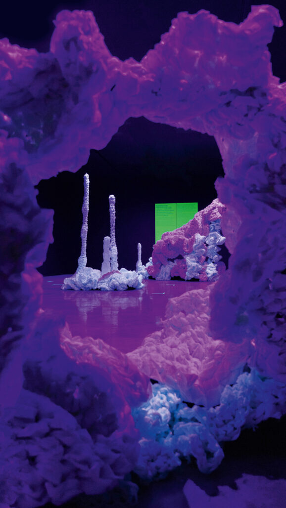 Die Papierstreifen, die dem Häkelprojekt „Crochet Coral Reef“ von Christine und Margaret Wertheim entstammen, formen an jeder Station als Auftakt der Schau ein immersives Szenario aus der Natur nach. Korallenriffe können sich bei Schäden überraschend schnell erholen. Doch die Regeneration gelingt immer seltener, durch den Klimawandel droht ein Absterben durch Ausbleichen.