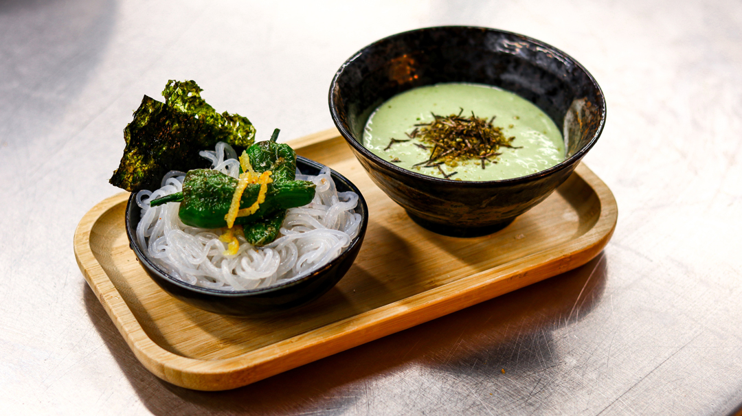Auf Zimmertemperatur abkühlen lassen und als Dip zu lauwarmen Nudeln servieren. Unsere Empfehlung sind japanische Shirataki- oder Somen-Nudeln.