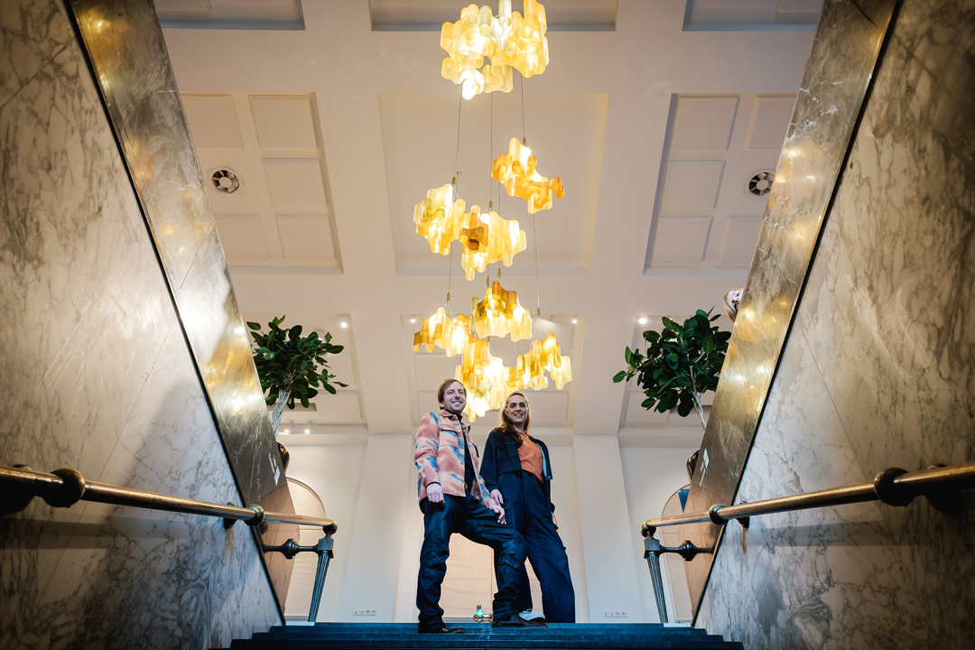 Bild: Maartje Dros und Eric Klarenbeek im Foyer des IDFA-Gebäudes in Amsterdam, das vom „Light Catcher“ beleuchtet wird. Das Lichtobjekt besteht aus im Labor gezüchteten, heimischen Algen und Seegras. Foto Bernard Kalu