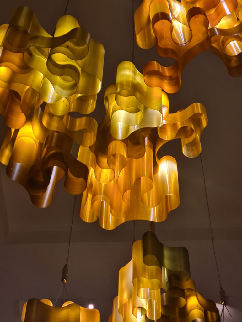 Das Licht im Foyer des IDFA-Gebäudes („International Documentary Film Festival Amsterdam“) verändert sich ständig. Je nach Tageszeit und Wetter fällt es anders durch die großen Fenster. Dazwischen hängt eine besondere Lampe, das diese Veränderungen nicht ausgleicht, sondern verstärkt. Der „Light Catcher“ des niederländischen Designstudios „Klarenbeek & Dros“ wurde speziell für den monumentalen Eingangsbereich entworfen. Das Objekt über dem Treppenraum besteht aus rund 60 bis 80 modularen Elementen und erinnert an einen Unterwasser-Tangwald, 3D-gedruckt aus einem biobasierten Algenmaterial. Tageslicht, Glühbirnen und innere Reflexionen sorgen dafür, dass sich Farbe und Wirkung im Lauf des Tages wandeln. Diese dynamische Lichtwirkung ist nicht nur ästhetisch, sondern macht die Materialität des Objekts auf subtile Weise erlebbar.